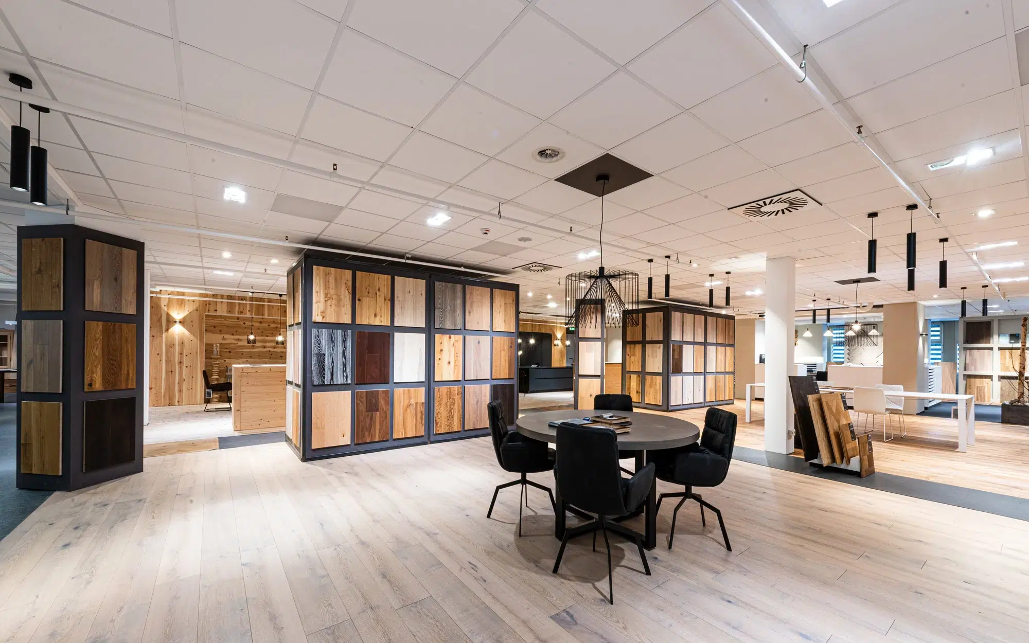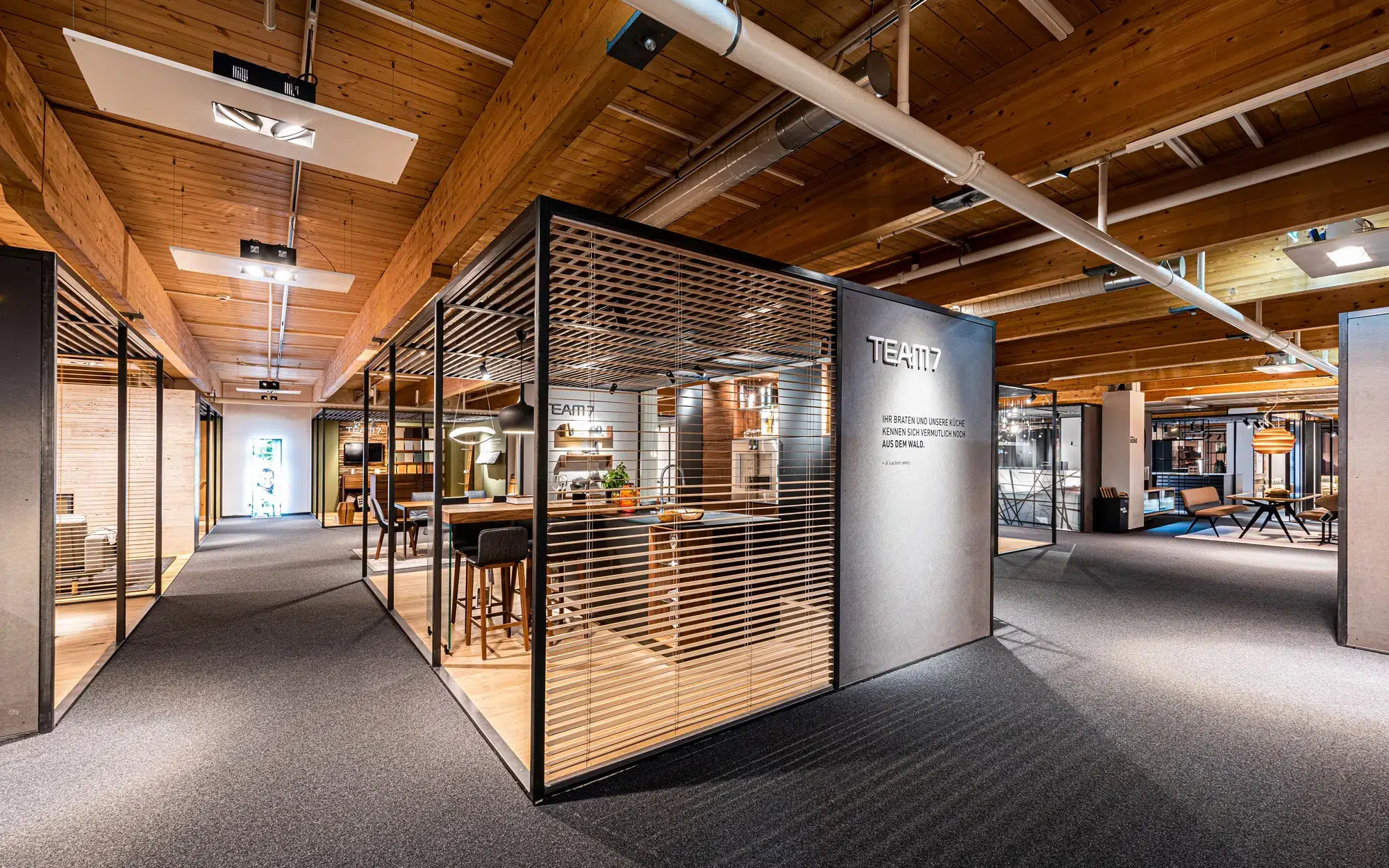 Moderne Büroräume mit Holzdecken, Glaswänden und Einrichtungshaus Föger-Möbeln.