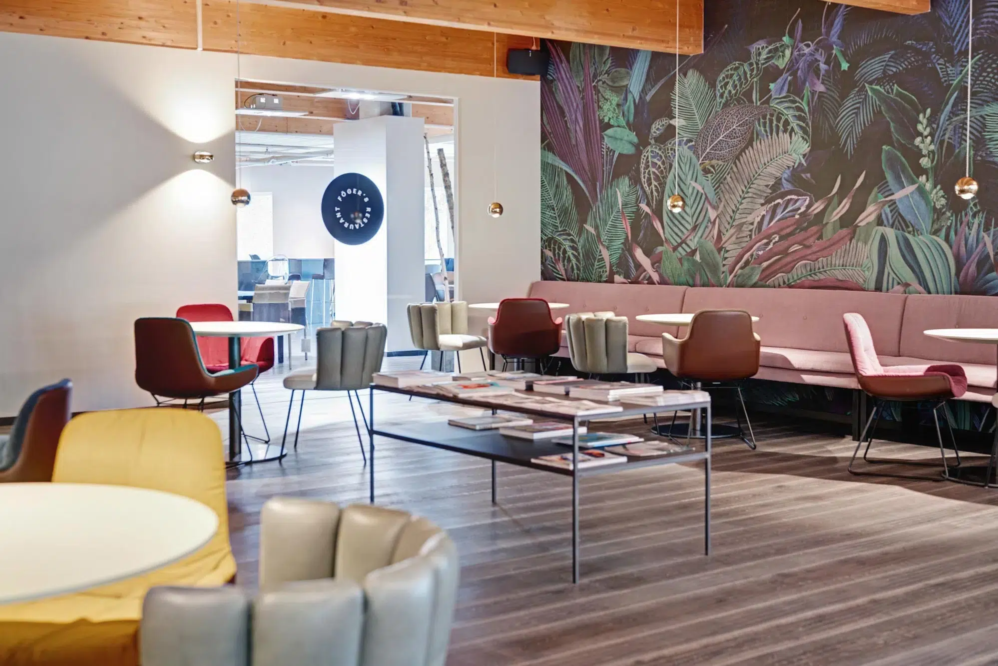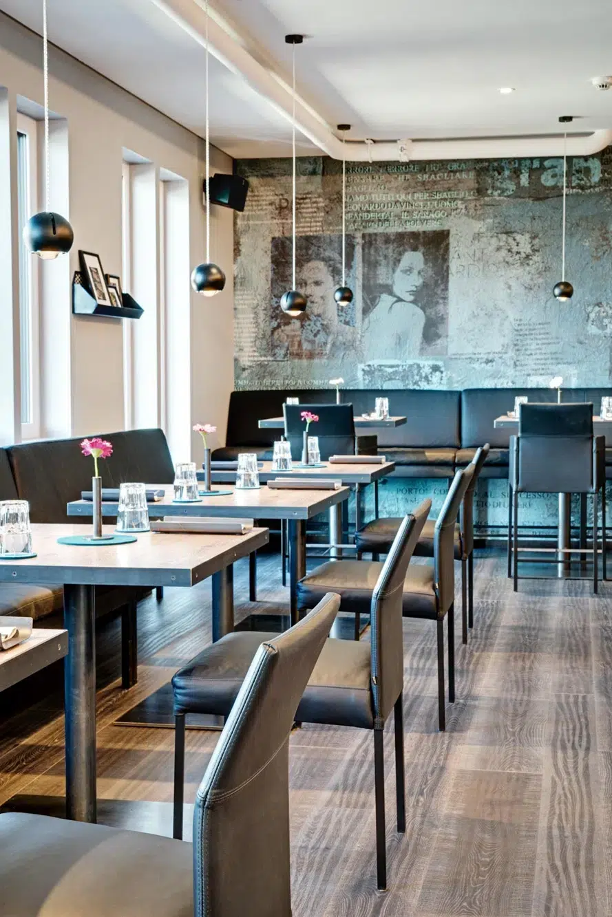 Föger's Restaurant ist mit schwarzen Sitzmöbeln, Holztischen und Wandkunst mit monochromen Gesichtern ausgestattet.