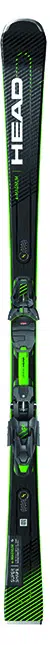 Schwarzer und grüner HEAD-Ski mit Bindung, vertikal vor weißem Hintergrund.