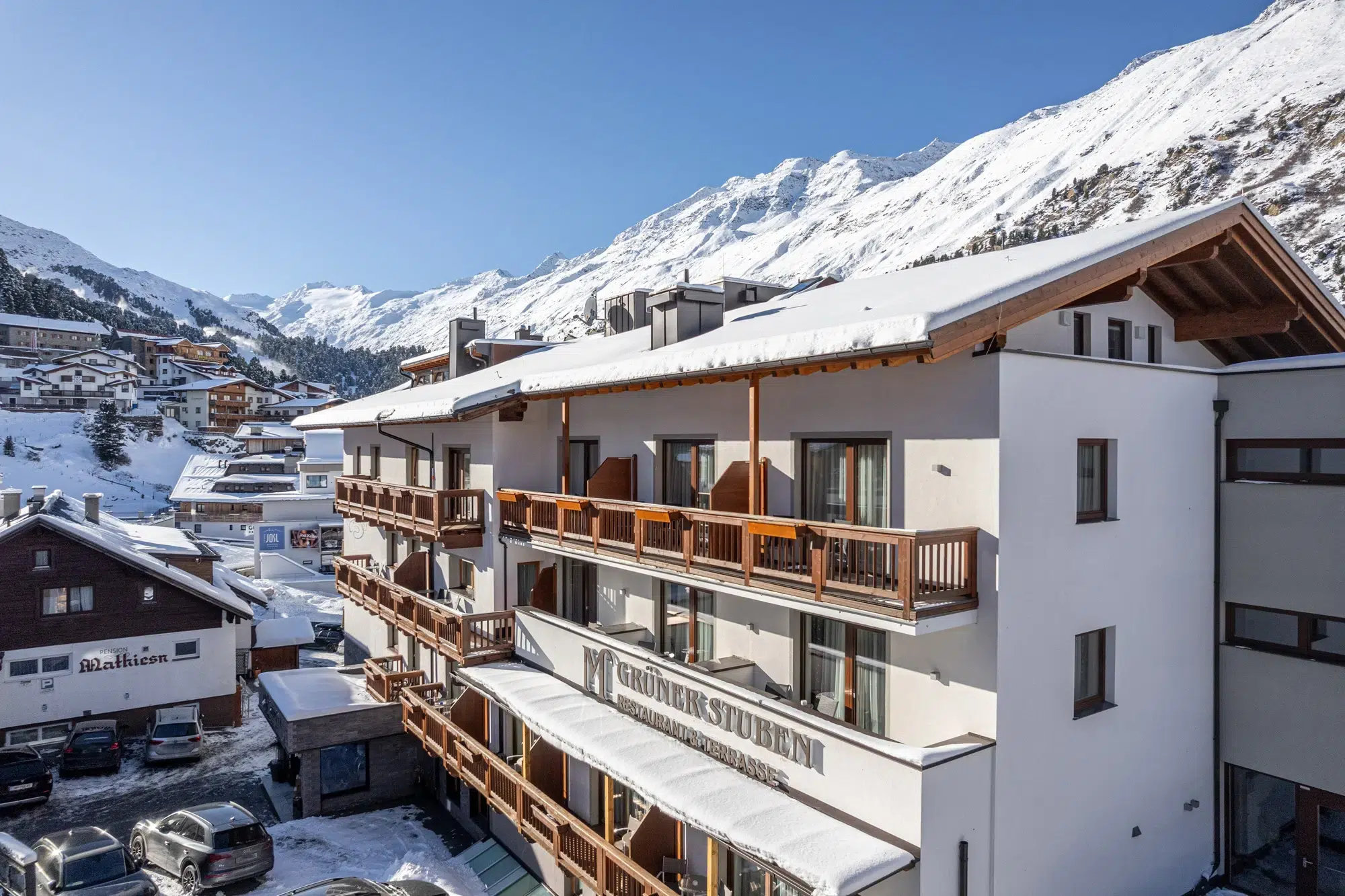 Verschneites Hotel Mathiesn mit Holzbalkonen, parkenden Autos und Bergen im Hintergrund.