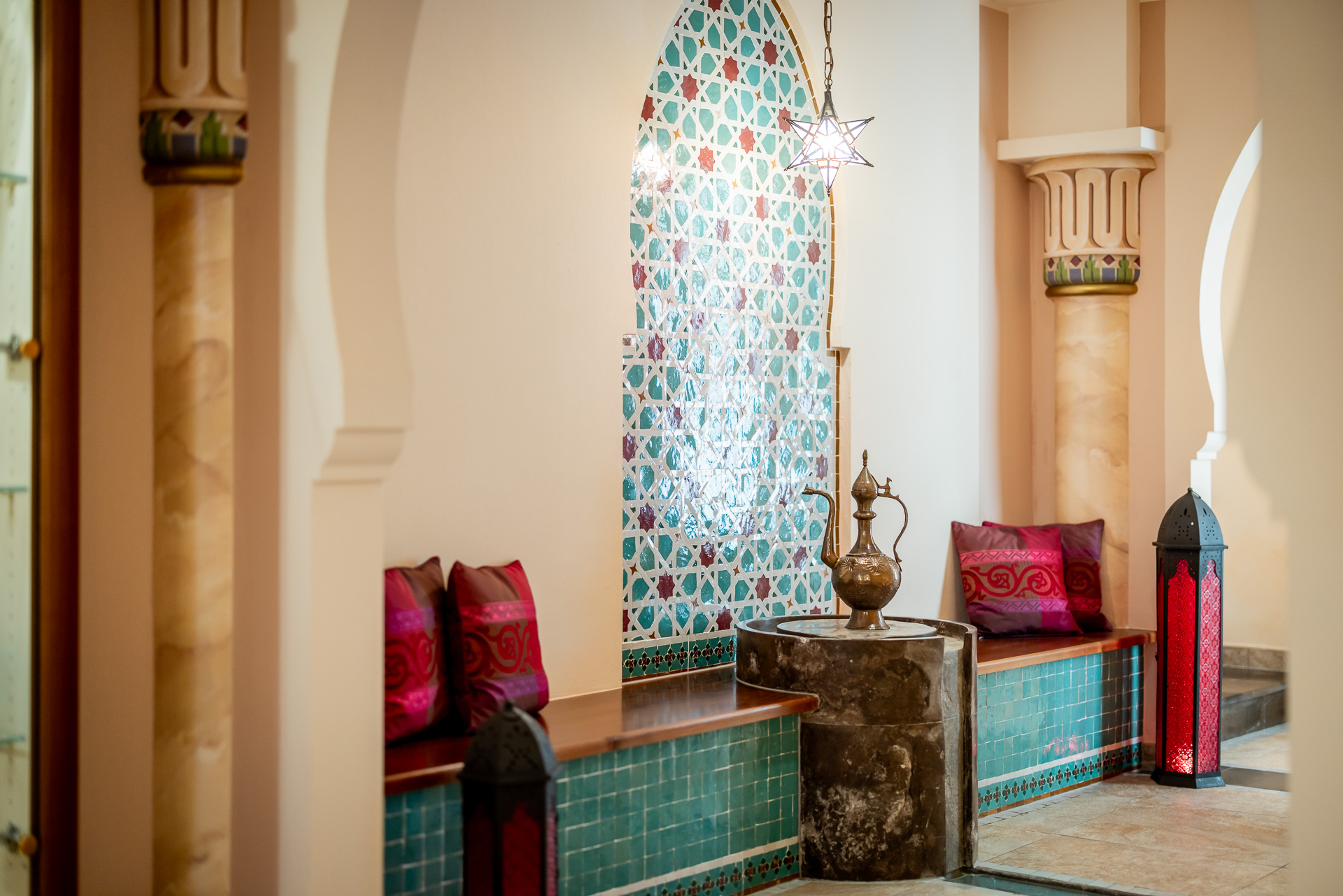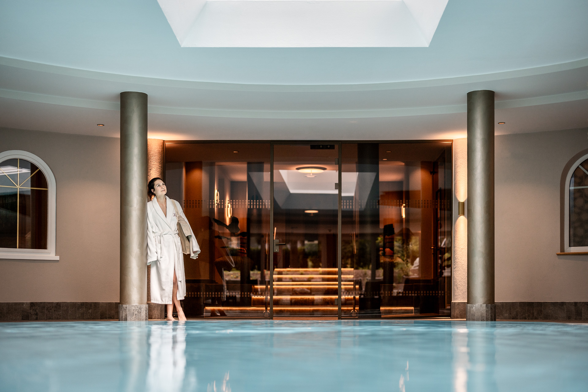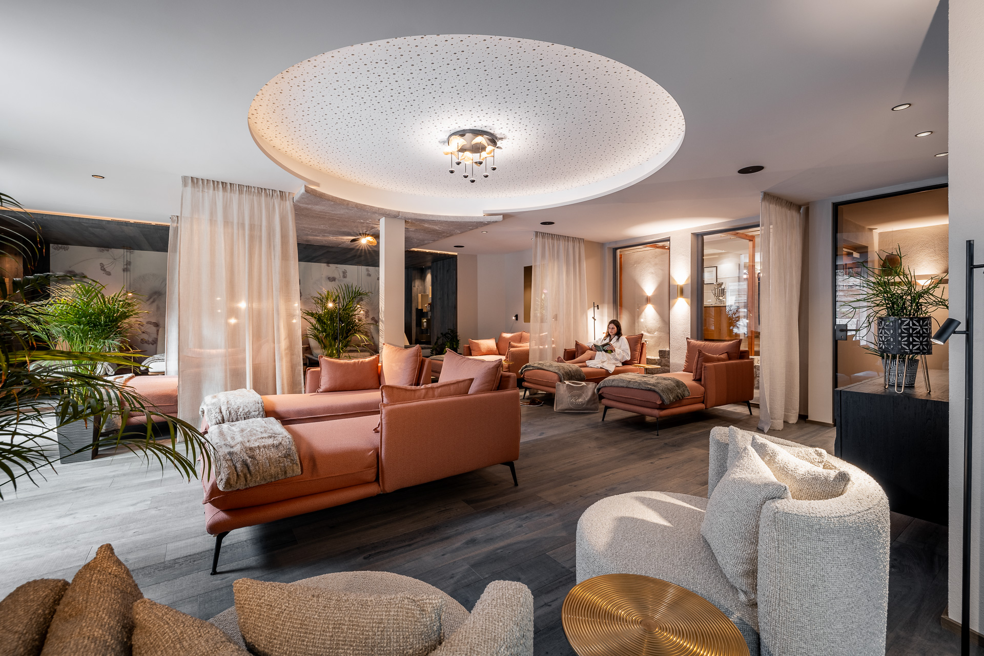 Frau mit dunklem Haar in einer Satinbluse lächelnd auf einer Couch im Hotel Rita.