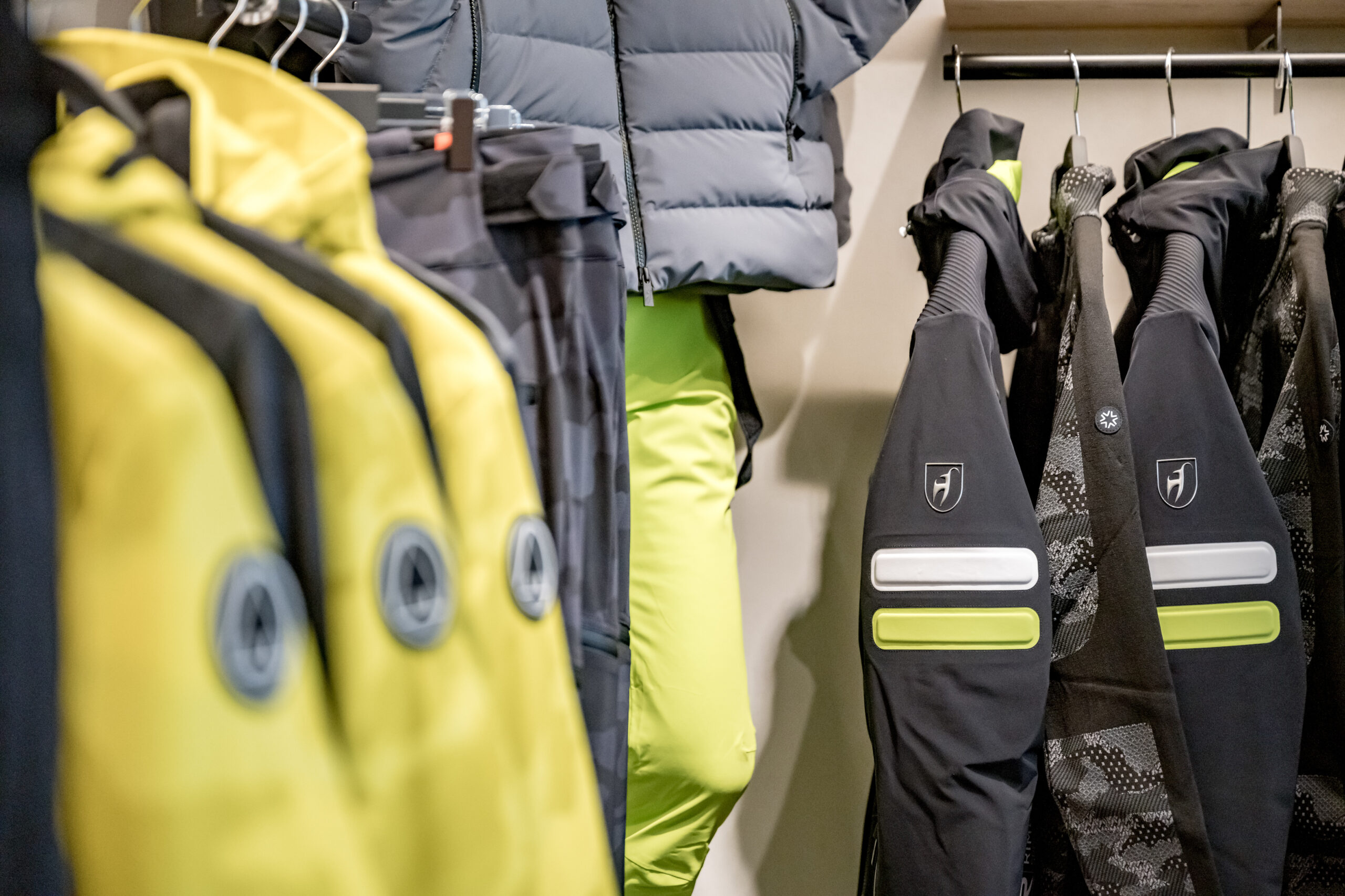 Modernes Bekleidungsgeschäft bei Riml Sports Längenfeld mit Jacken und Pullovern in Regalen.