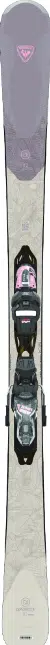 Ein weiß-grauer Ski mit schwarzer Bindung und einem goldenen Dreieckslogo an der Spitze.